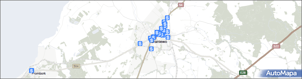 mapa Braniewo, Braniewo na mapie Targeo